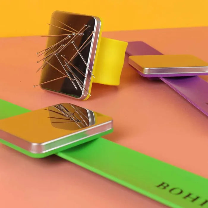 Keep your sewing pins and needles always within reach with this ingenious Bohin magnetic pin bracelet – the ultimate wrist pin holder for sewists, dressmakers, quilters, and crafters. Say goodbye to dropped pins and scattered needles on your sewing table!